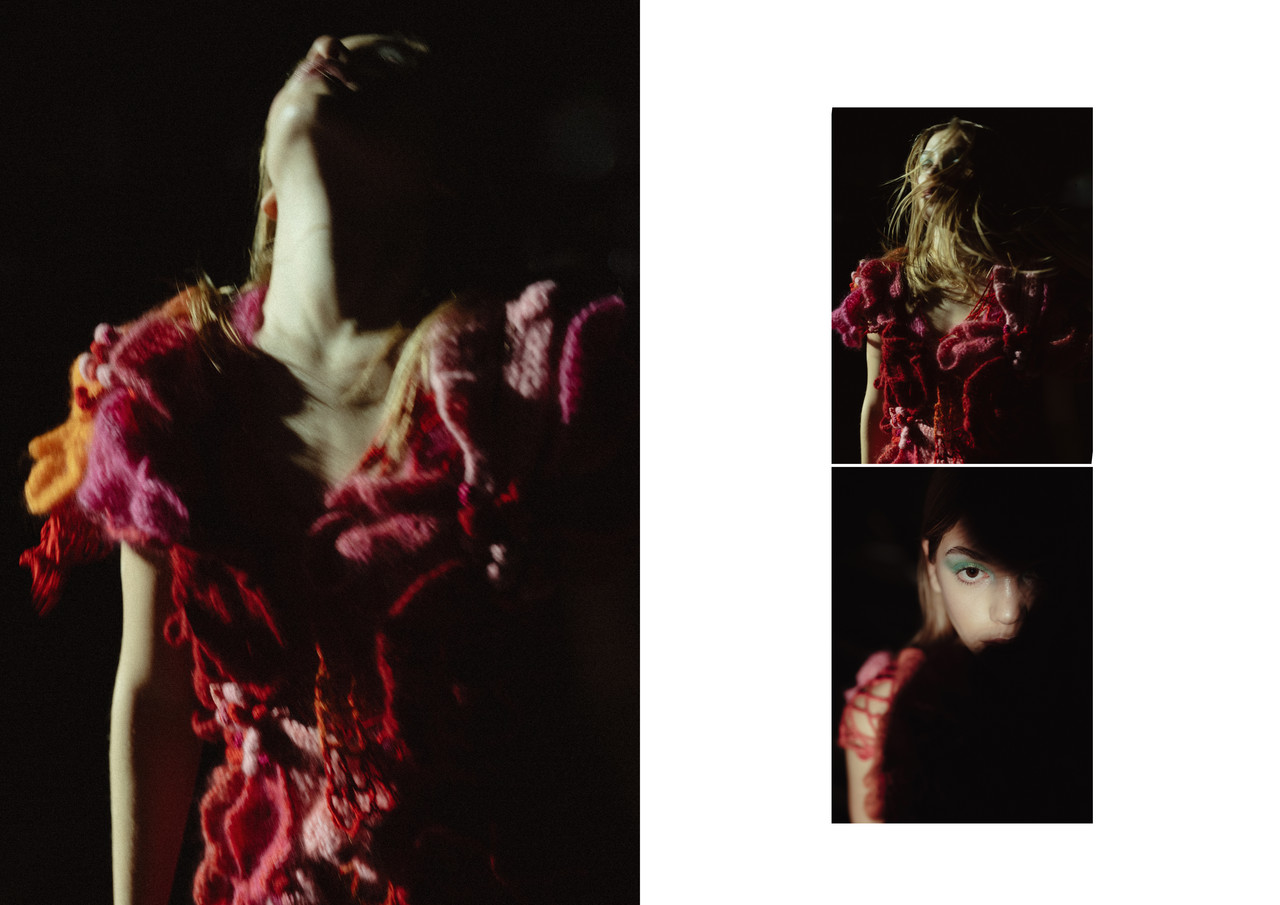 U fokusu je crvena haljina snažan simbol vitalnosti, erotske energije i hrabrosti za novi početak, kukičana strpljivo i sigurno, kao da nastaje u sporom, promišljenom ritmu, onom koji je već godinama zaštitni znak Nataše Mihaljčišin. Poput ritualnog plašta, ona naglašava snagu tijela koje ne odustaje od svoje živosti. Crvena boja istodobno vrišti i šapuće: o strahu, ali i o spremnosti da se vidimo u očima drugih. Ona označava granicu na kojoj nelagoda postaje puls, a drhtaj ritam.