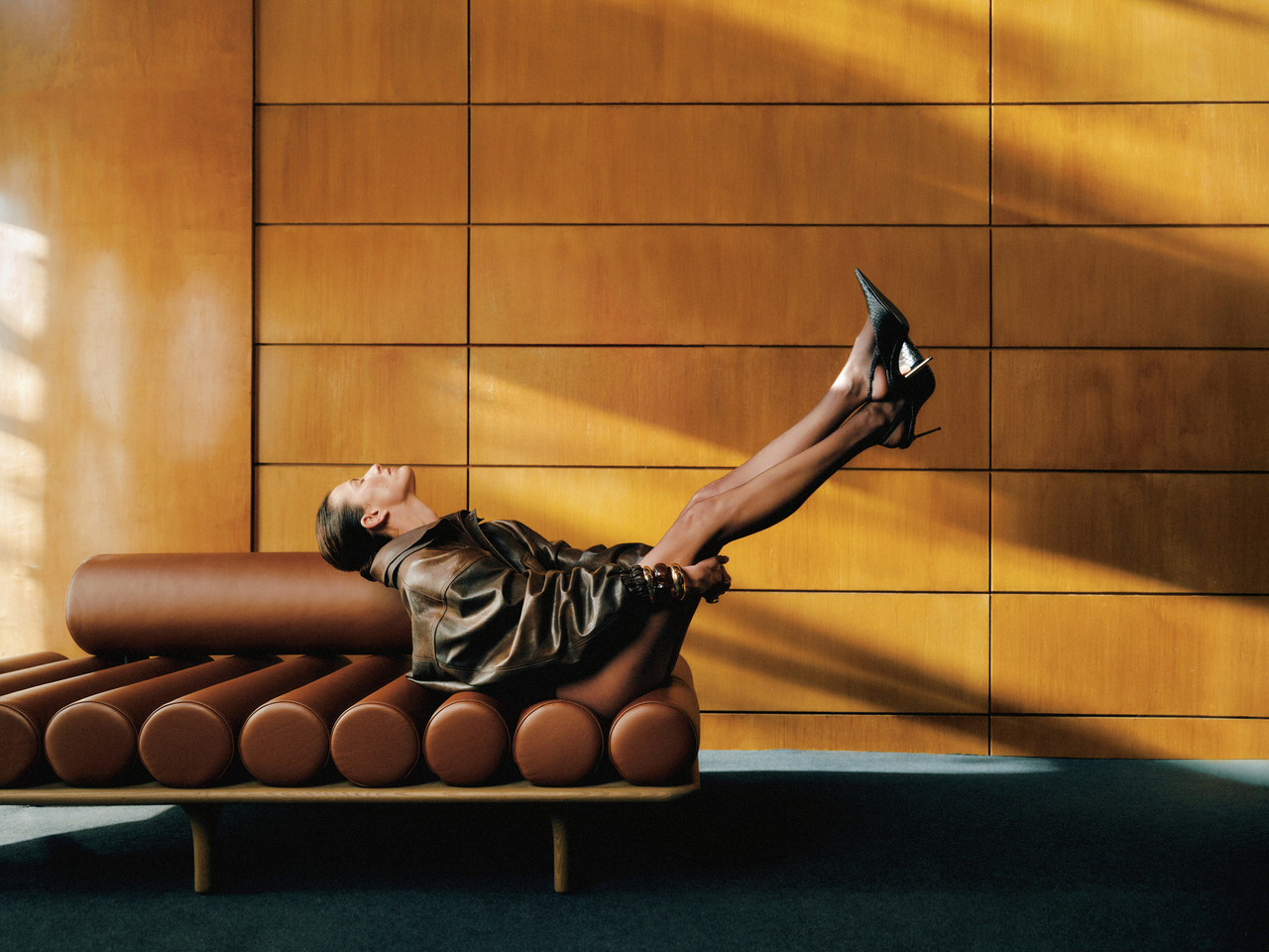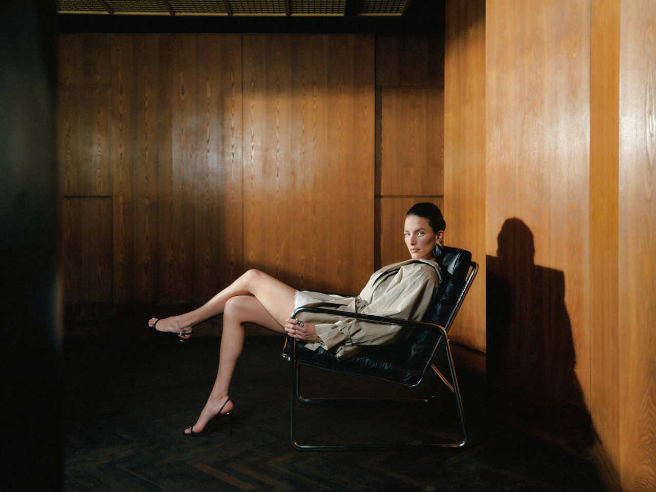 Snimljena u monumentalnom interijeru inspiriranom mid-century modernom arhitekturom, kampanja koristi prostor kao ključni narativni element. Zakrivljeni drveni paneli, duboke sjene i dramatične linije svjetla stvaraju scenografiju koja gotovo djeluje filmski. Prostor postaje pozornica na kojoj moda dolazi do punog izražaja, dok pažljivo odabrani komadi namještaja – crvena “Le Mura” sofa i “Five to Nine” daybed brenda Tacchini, ustupljeni iz zagrebačkog showrooma Trika – dodatno naglašavaju arhitektonski karakter i taktilnost prostora.